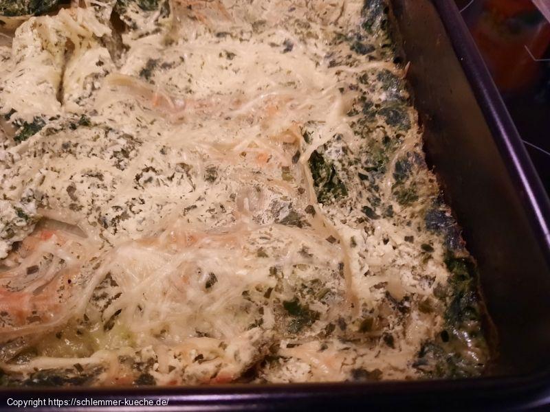 In eine gefettete Auflaufform abwechselnd die Lasganeplatten, Spinat und die Käsemasse geben. Darüber den restlichen Käse streuen und für ca. 35 Minuten bei 200 Grad im Backofen backen.