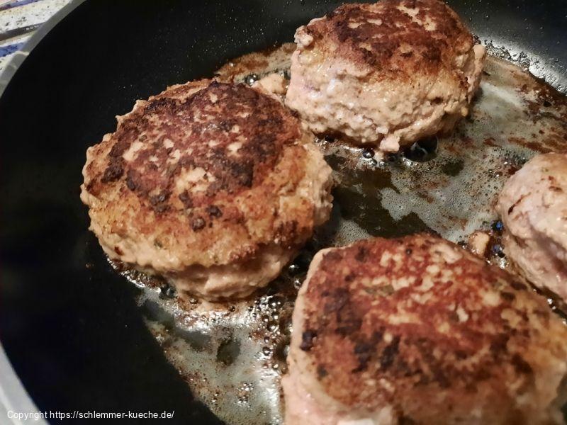 Die Frikadellen in einer Pfanne mit Öl gar braten. Das Öl sollte dabei nicht zu heiß sein, damit der Käse schön zerläuft.
