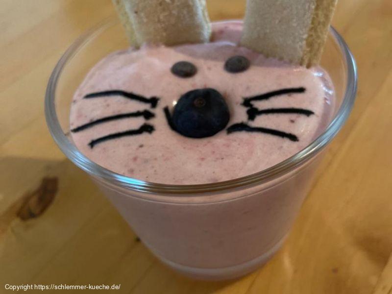 Erdbeeren auftauen und pürieren. Sahne steif schlagen. Quark, Vanillezucker, Zucker und Erdbeermus verrühren, dann Sahne unterheben. Die Masse in Gläser füllen und dann Löffelbiskuit als Ohren, Blaubeeren als Nase, Schokodrops als Augen und mit der Lebensmittelfarbe die Schnurrbarthaare aufzeichnen. Vor dem Verzehr kalt stellen.