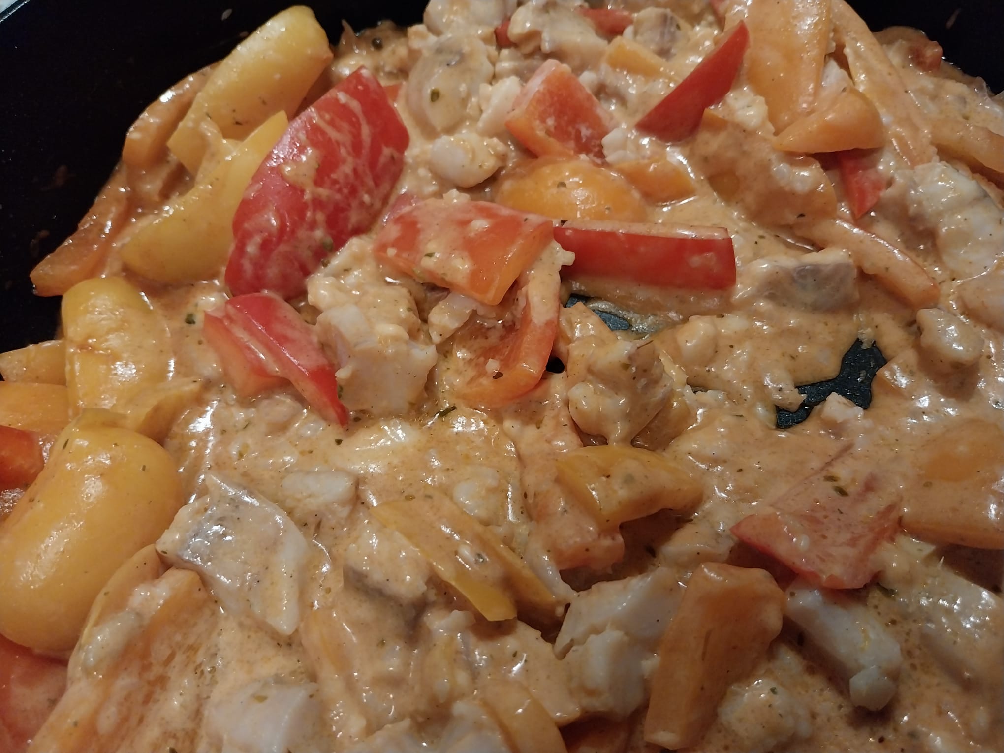 In einer kleinen Schüssel die Speisestärke mit Creme fraiche verquirlen. Dann ebenfalls in die Pfanne geben, einrühren und kurz aufkochen. Zum Schluss den Fisch wieder dazu geben und nochmal kurz erhitzen.