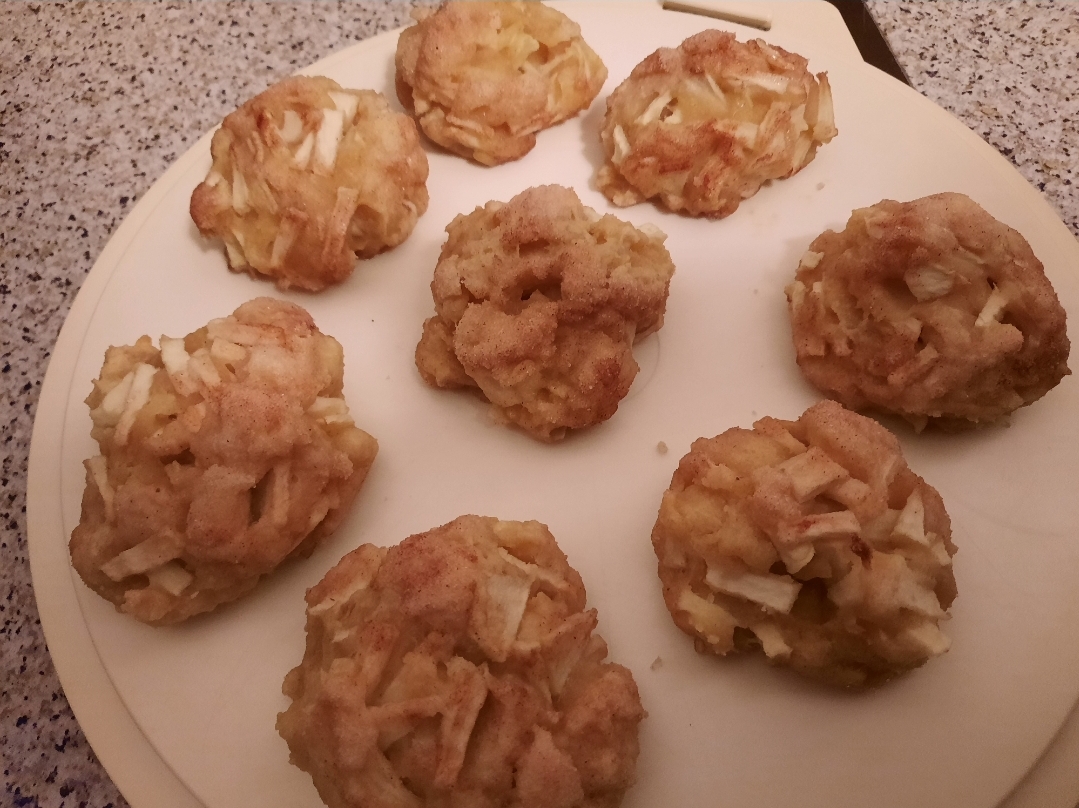 Die Äpfel schälen, in kleine würfeln schneiden und mit den Händen unter den Teig kneten. Aus dem Teig 8 gleichgroße Portionen entnehmen und diese jeweils zu einer Kugel formen und im Zimtzucker wälzen.