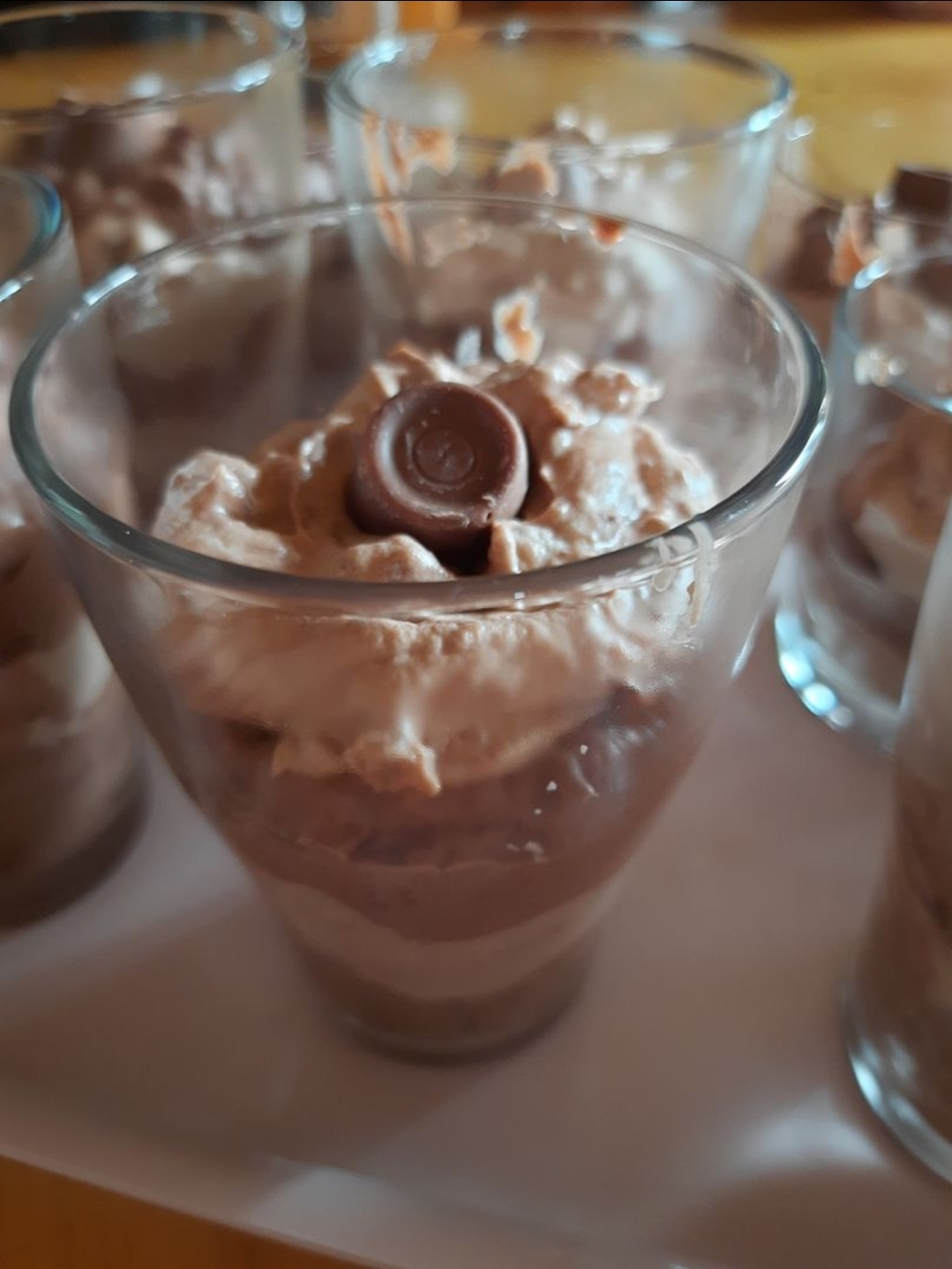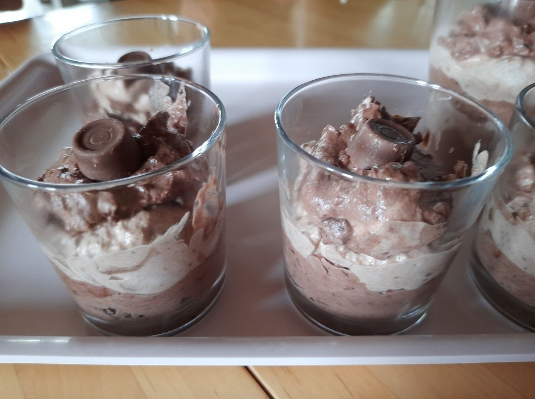 Nun die Creme abwechselnd dunkel und helle Creme in Gläser füllen, zum Schluss nach belieben dekorieren.