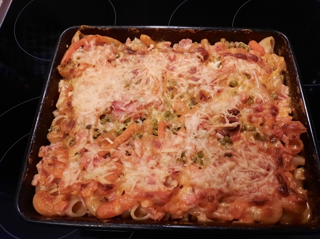 Die Nudeln in eine kleine Auflaufform geben. Den Schinken in Würfel schneiden und zusammen mit den Erbsen darüber verteilen.