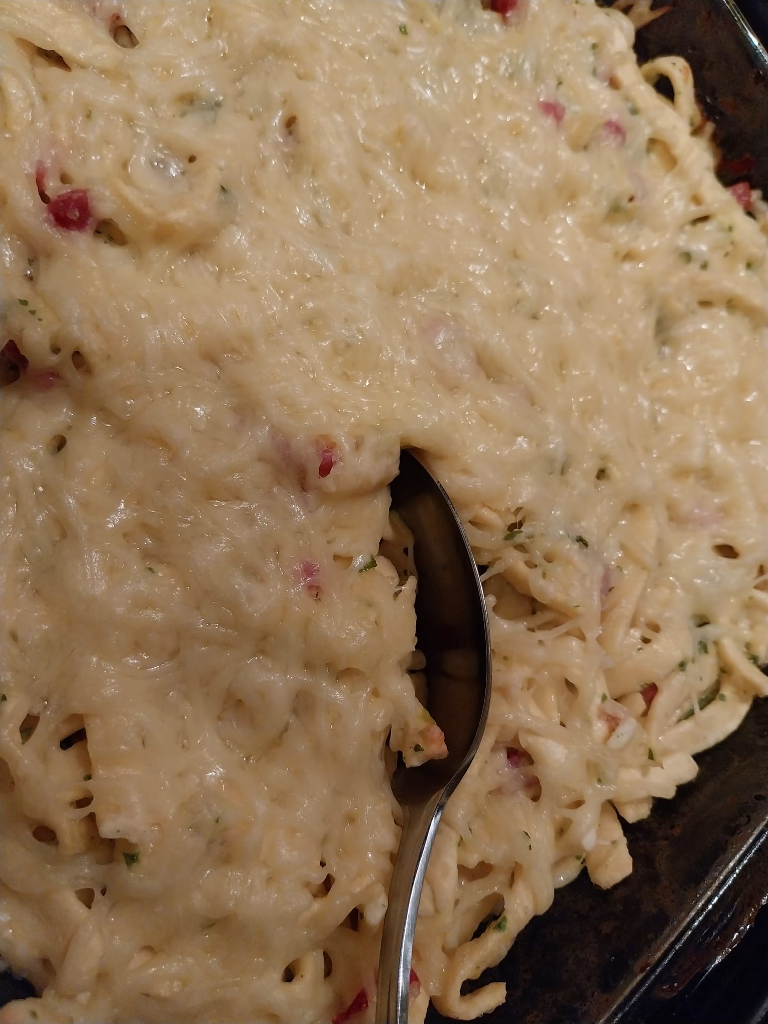 Alles in eine gefettete Auflaufform umfüllen und die Spätzle unterheben. Den restlichen Käse darüber streuen und für ca. 20 Minuten bei 200 Grad im Backofen backen.